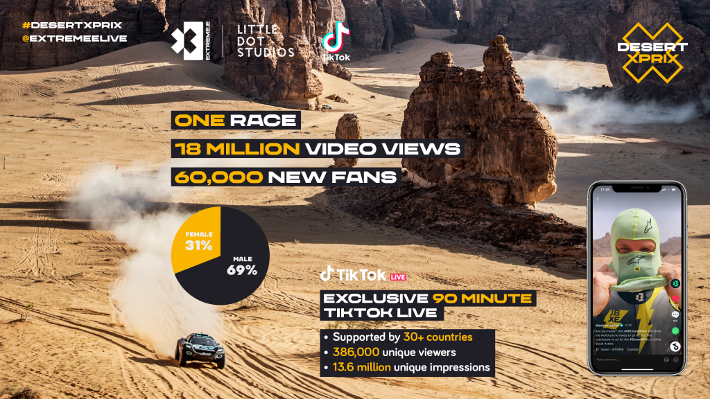 Across the race weekend, Extreme E pulled in 18.5 million organic views across TikTok content produced by partner Little Dot Studios, with a staggering 17.2 million people checking out #DesertXPrix videos alone. The championship also acquired 60,000 new fans, after digital media giant Little Dot Studios activated the new partnership utilising its vertical video expertise, on behalf of the championship.